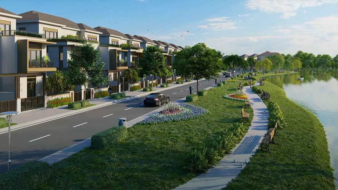 Quy mô dự án: Khu đô thị khép kín đa tiện ích, gồm tổ hợp Nhà phố, Biệt thự cao cấp với khoảng 1000 ha, được bao bọc bởi hơn 32km đường bờ sông cùng mật độ cây xanh phủ toàn khu cao.